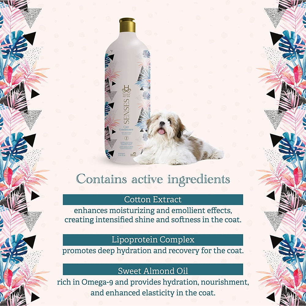 USAGE & APPLICATION: This conditioner is designed to be used with the Senses Care Moisturizing Booster. Simply mix 10–20 drops of booster into about 20 grams (0.71 ounces) of conditioner and mix thoroughly. Apply to freshly shampooed pet and rinse.